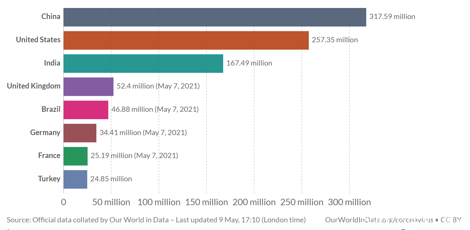 截止2021年5月8日,美國累計接種2.57億劑,居第二位,其中單日新增接種257萬劑。美國至少接種一劑的人羣佔比為45.2%,完成兩劑次的人羣佔比為33.7%。美國每百人累計接種75.95劑,是中國的3.49倍。自3月23日以來,美國日均接種278萬劑,為中國同期日均接種數的55%。