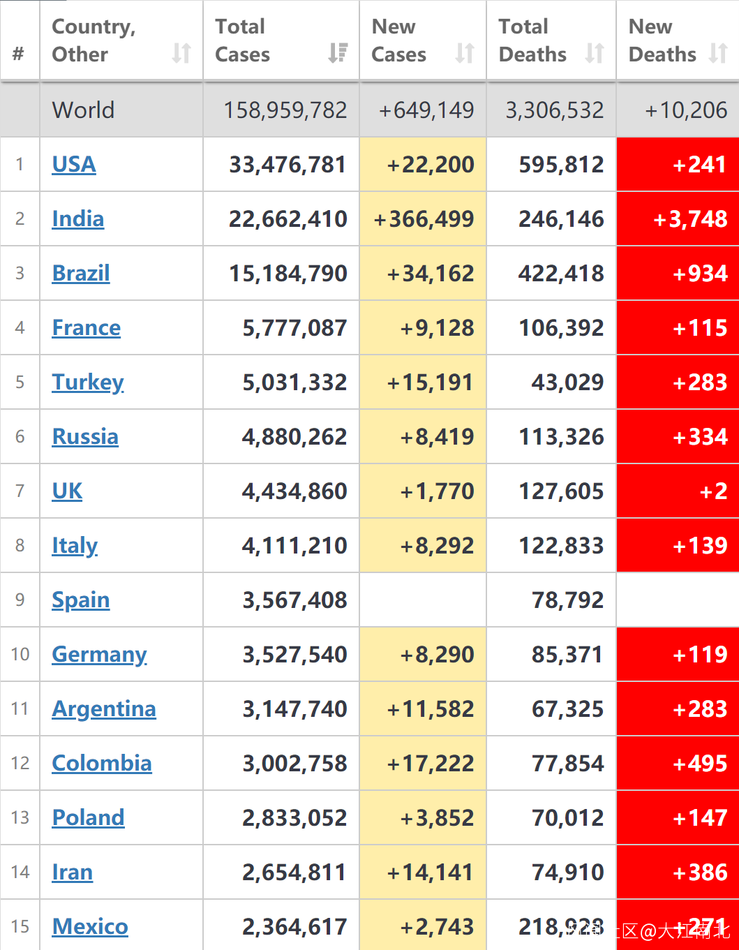 5月9日,全球新增新冠確診64.9萬例;累計確診1.59億例;新增病亡1.0萬例;累計病亡330.7萬例(週末效應)。