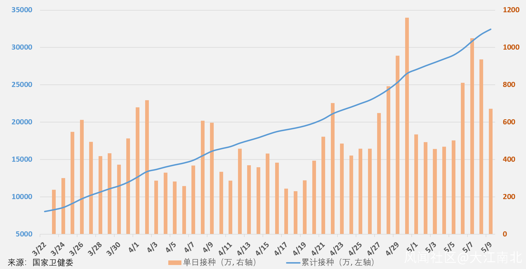 截止2021年5月9日,中國大陸累計接種新冠疫苗3.24億劑,繼續位居全球第一位,其中單日新增接種672萬劑,環比減少264萬例。我國自3月23日以來,日均接種508萬劑。中國每百人累計接種22.53劑,環比增加0.47劑。