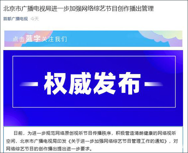 據“首都廣播電視”微信公眾號5月10日消息,日前,為進一步規範網絡原創視聽節目傳播秩序,積極營造清朗健康的網絡視聽空間,北京市廣播電視局印發《關於進一步加強網絡綜藝節目管理工作的通知》,對網絡綜藝節目的創作播出提出進一步要求。