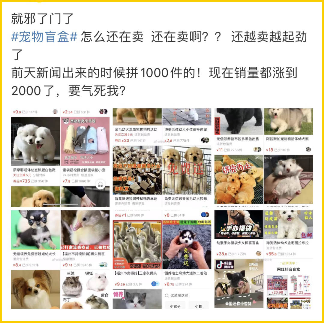 然而時至今日,就在“愛之家”的救助工作忙到不停歇時,電商平台上的“寵物盲盒”仍未下架,銷量居高不下,不知道監管部分,能否加大力度。我們也希望在更多的平台上,看到有關於“寵物盲盒”的發聲。