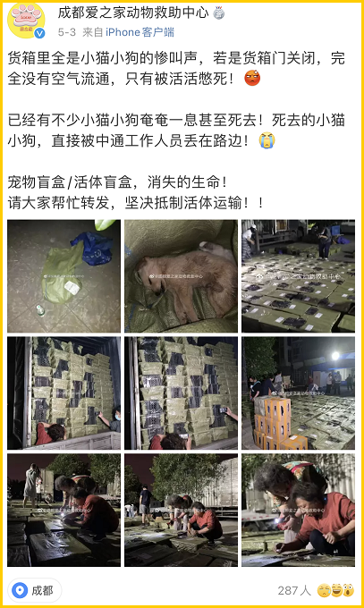 一條沾滿了鮮血的寵物產業鏈,由此形成。貓狗販們與快遞公司勾結,前有做的光鮮亮麗的假圖廣告,後有狗場快遞公司一條龍,趁着深夜,在完全違反活體運輸的基本法律前提下,一車車奶貓奶狗被強行裝進“盲盒”,發往“新家”,送到搓手等待開盒抽獎的“主人們”手中。