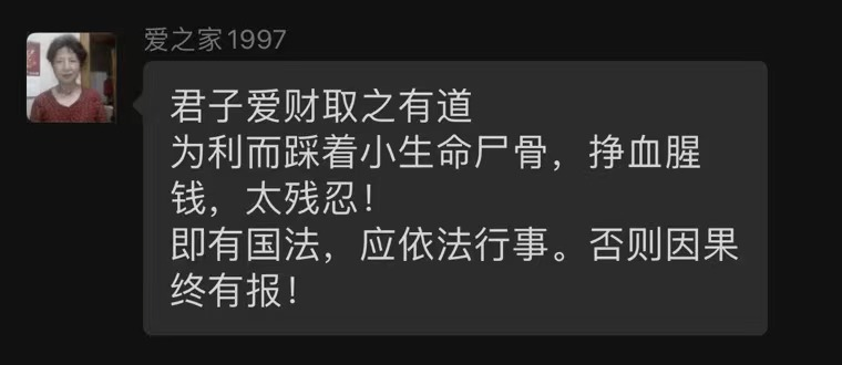 君子愛財取之有道,為利而踩着小生命生命屍骨,掙血腥錢,太殘忍!既有國法,應依法行事。否則因果有報!