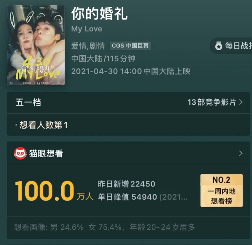 《你的婚禮》如果不撤檔,就是7部愛情片扎堆在5月20號上映。而且在《中國醫生》《古董局中局》等大片相繼撤檔後,《你的婚禮》成了五一檔映前熱度最高的電影,提檔提前收割愛情片受眾,可以説是非常明智了。不然等到520,再剛需的觀影需求,都愛不過來這麼多愛情片。
