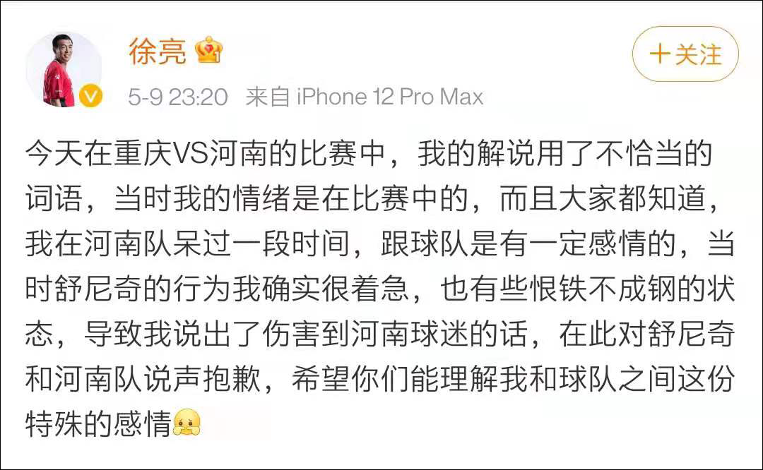 5月9日晚23:20,徐亮在其微博上就自己的不當言論道歉,稱自己是“恨鐵不成鋼”,希望得到舒尼奇和河南隊的理解。