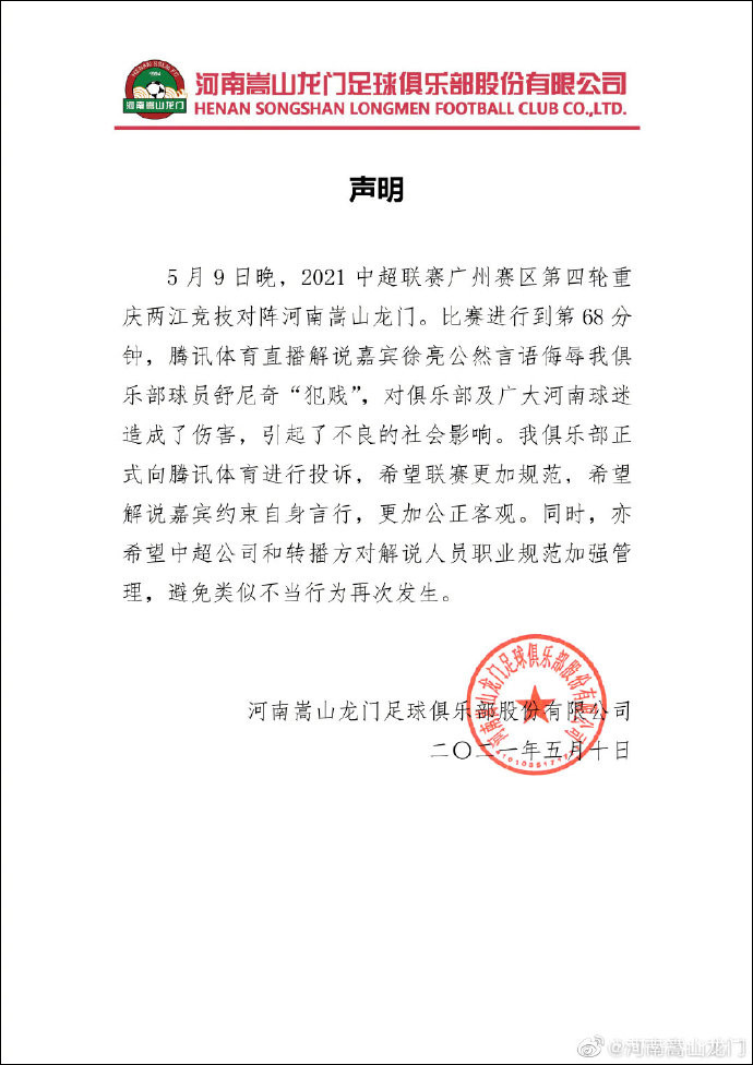 聲明寫道:“5月9日晚,2021中超聯賽廣州賽區第四輪重慶兩江競技對陣河南嵩山龍門。比賽進行到第68分鐘,騰訊體育直播解説嘉賓徐亮公然言語侮辱我俱樂部球員舒尼奇‘犯賤’,對俱樂部及廣大河南球迷造成了傷害,引起了不良的社會影響。我俱樂部正式向騰訊體育進行投訴,希望聯賽更加規範,希望解説嘉賓約束自身言行,更加公正客觀。同時,亦希望中超公司和轉播方對解説人員職業規範加強管理,避免類似不當行為再次發生。”