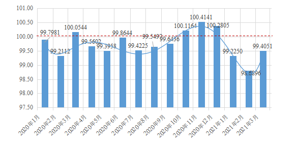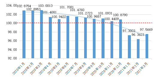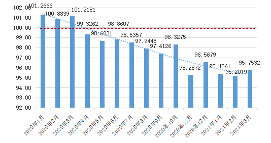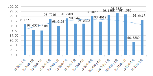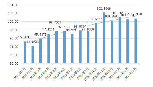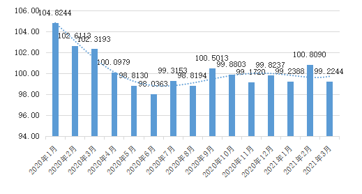 **(5)消費預期指數。**2021年第1季度,反映消費信心走向的消費預期指數保持了相對平穩的走勢,一方面延續了2020年第4季度99-100之間的總體指數水平,另一方面又在春節的驅動下創造了2月份100.8090的相對高點。可見,全球疫情的持續蔓延並未對我國居民的消費信心構成進一步的衝擊,我國疫情的成功防控雖然抑制了當期消費的釋放和實現,但也提振了居民的消費信心,改善了居民的消費預期,預計消費預期指數重上100點榮枯線指日可待。