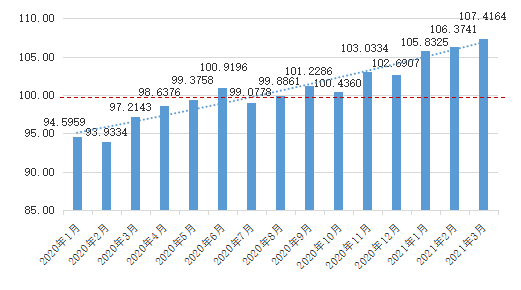 **(4)消費成長指數。**2021年第1季度,反映消費結構升級的消費成長指數上攻走勢顯著。2020年因疫情因素受到嚴重抑制的消費升級趨勢,在2021年第1季度呈現出欣欣向榮的走勢特徵。1-3月,消費成長指數從105.8325到106.3741再到107.4164,一步一跨越地創造了階段性高點,並展現了持續上行的潛力。這説明居民消費正從新冠疫情衝擊下的保障型消費訴求向消費結構升級內生動力驅動下的成長型消費訴求持續迴歸。