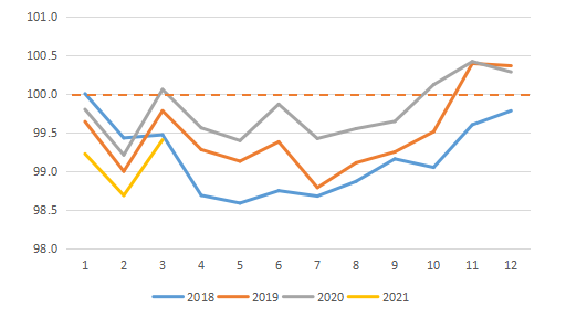 以2018年1月作為基期(指數值100),縱觀2018年以來我國消費的整體發展方向,年度平均指數從2018年的99.1725到2019年的99.4683再到2020年的99.7759,展現了我國居民消費即使在新冠疫情的影響下仍穩健擴容升級的良性態勢。然而,2021年第1季度消費指數驟降至99.1066,呈現出2018年以來最為低迷的同期表現,再次印證了全球疫情擴散和中國疫情防範對消費行為和消費心理的深刻影響。
