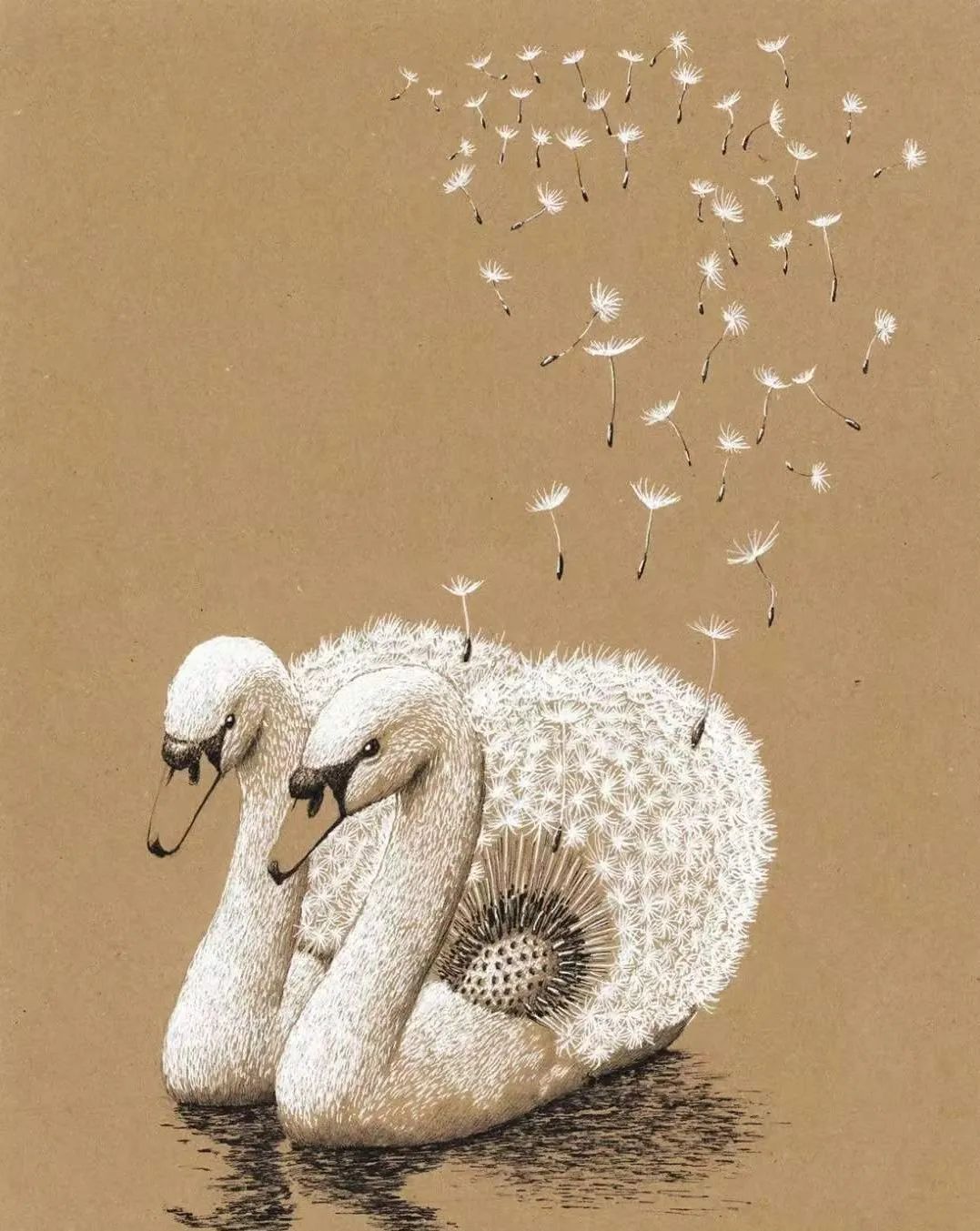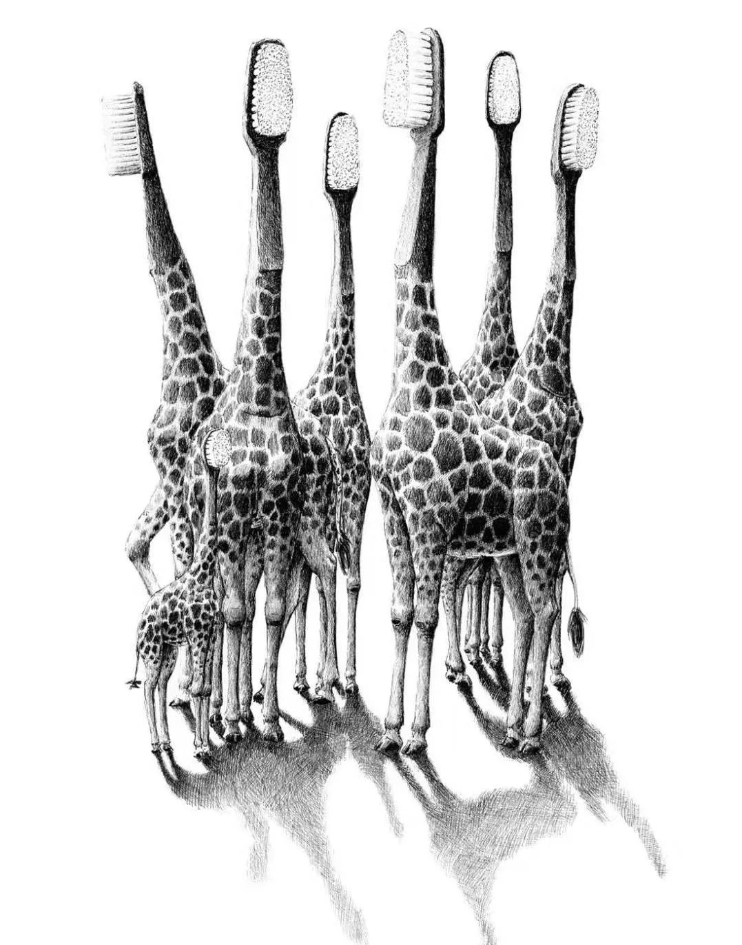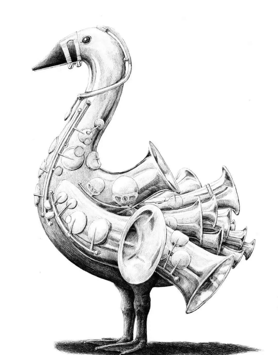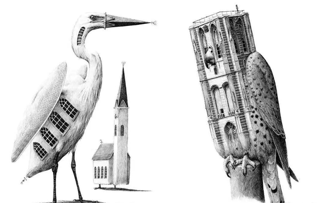 不同於上述風格,Redmer的作品沒有強烈的色彩。他以黑白素描形式進行插畫創作,常常將動物和其他日常事物如建築、植物等相結合,進行大膽想象、挪用、替換。