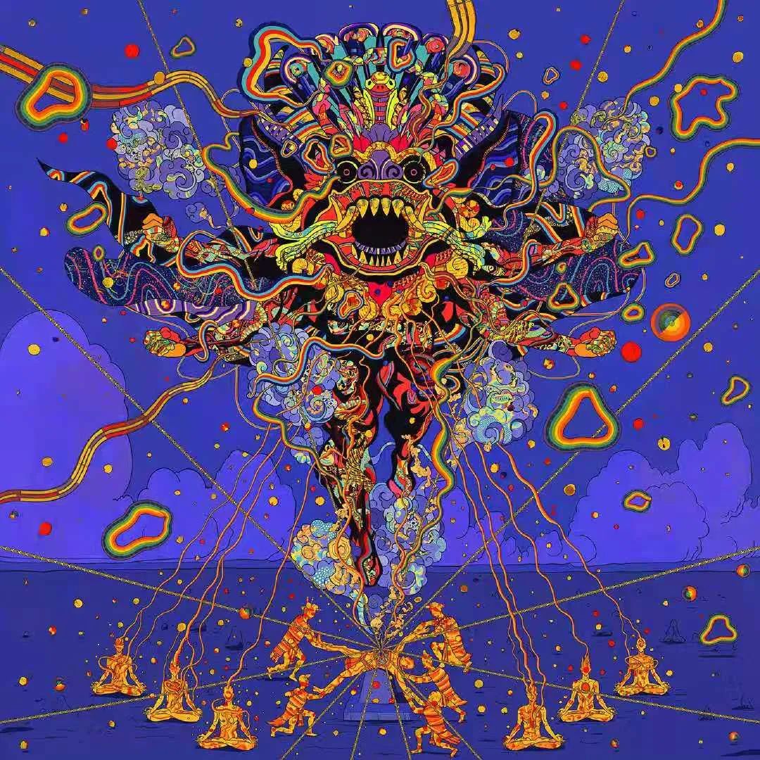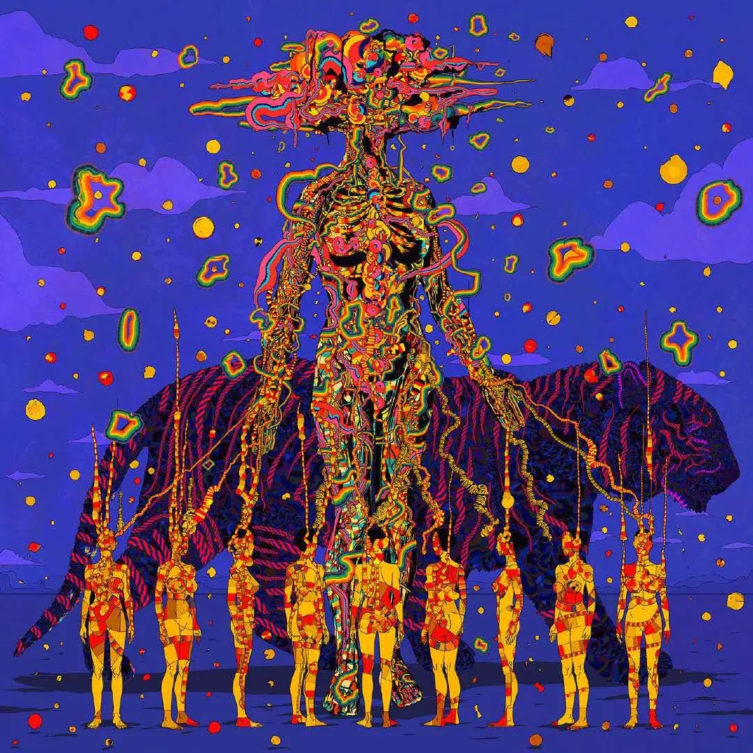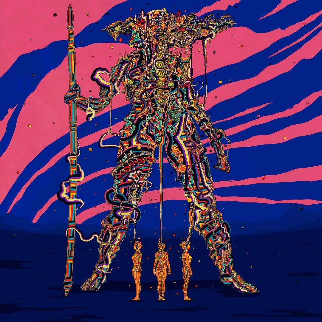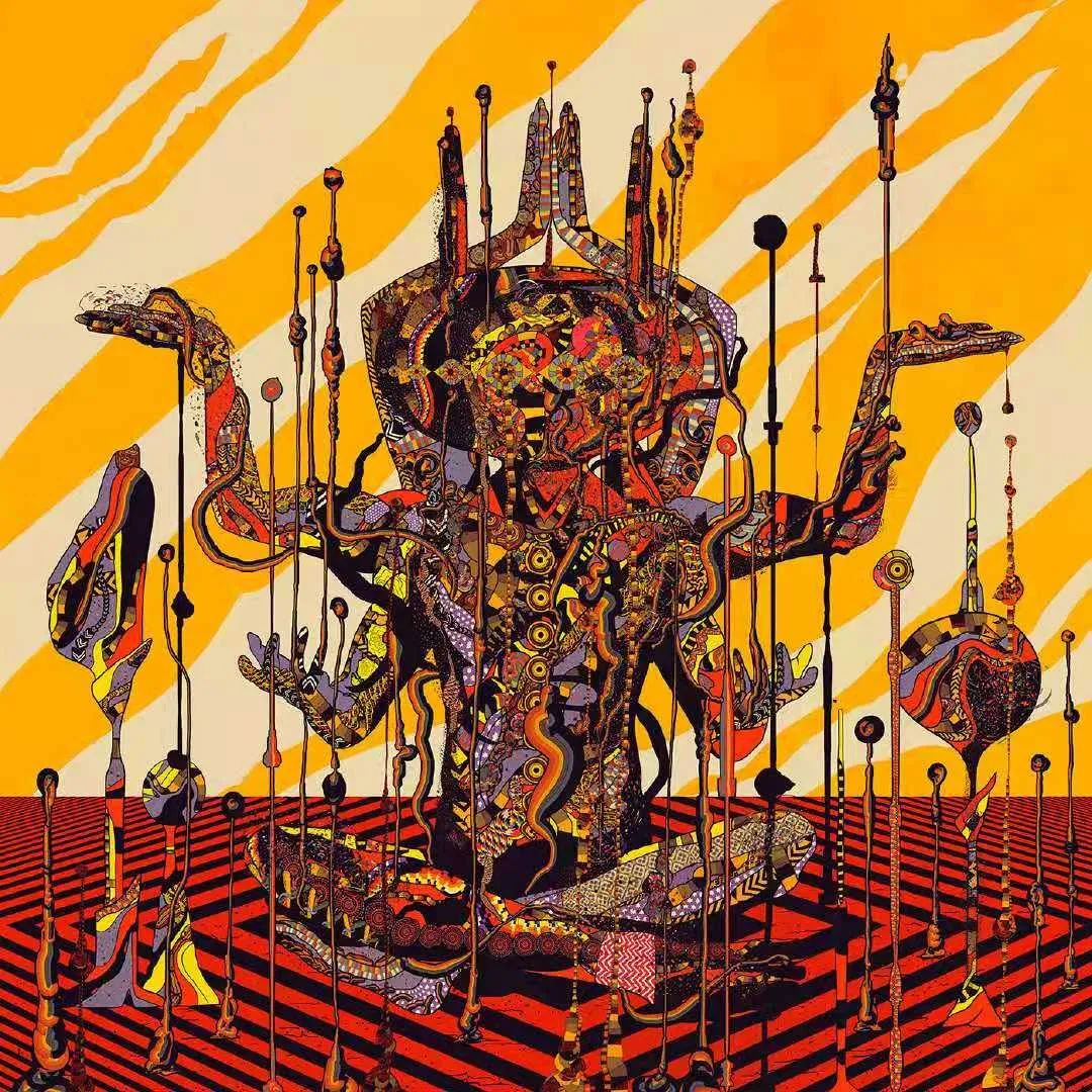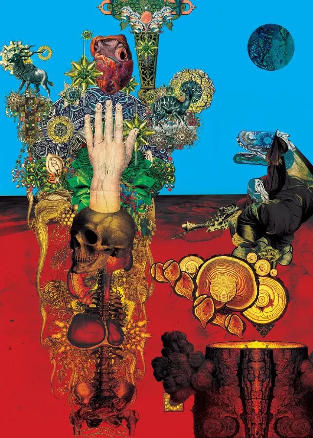濃烈的色彩作為背景,先抓住你的吸引力。然後你再細品,人骨、骷髏、尖牙利爪,好像能認出一些已經被抽象化處理的東西……