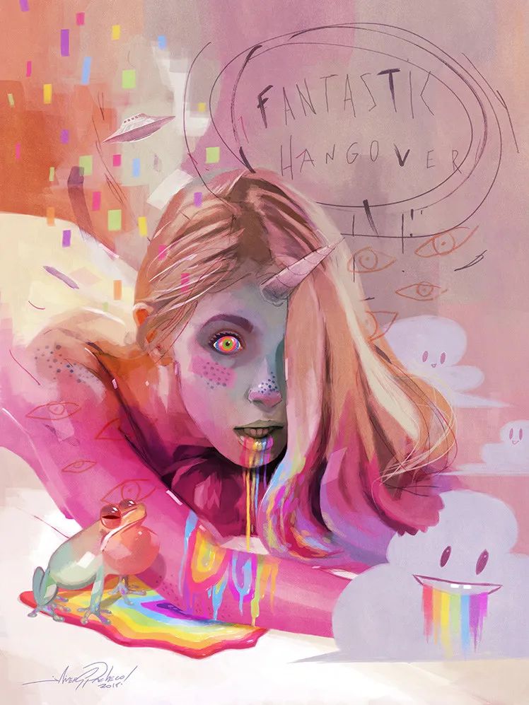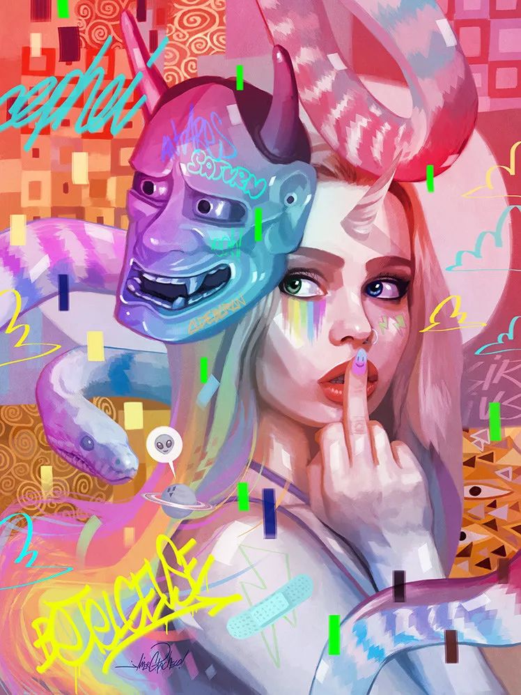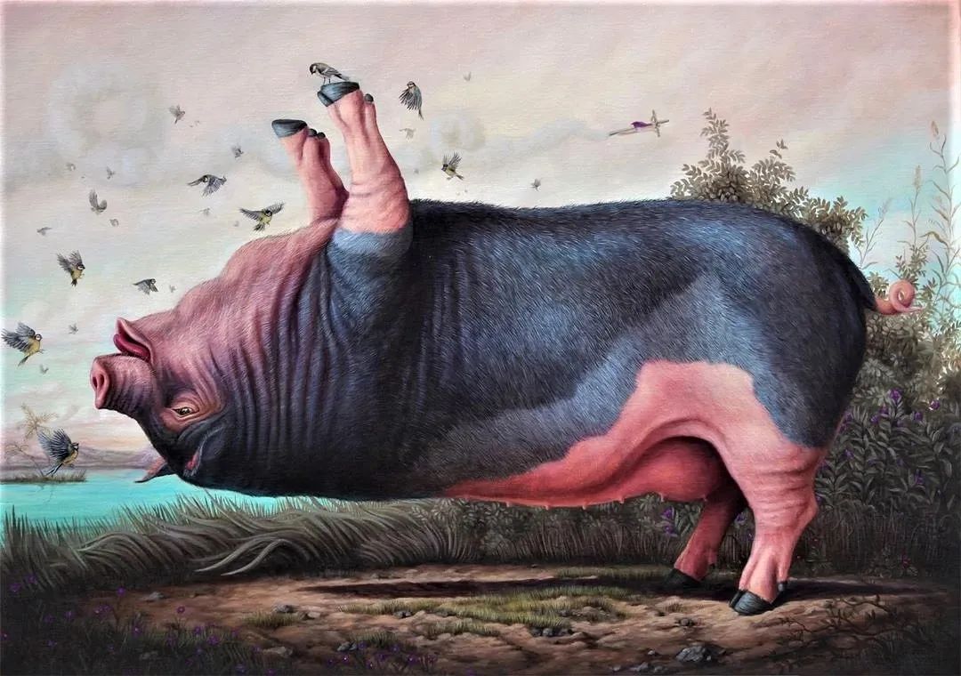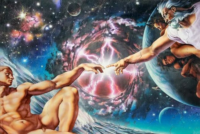 學院派出生他,經常在古典畫作中加入戲謔地現代元素。抽煙的維納斯,喝酒的丘比特,穿越星際相會於外太空的亞當和上帝……