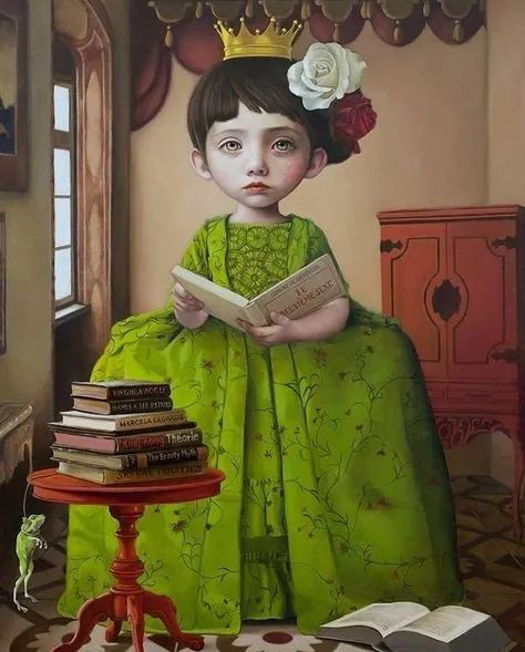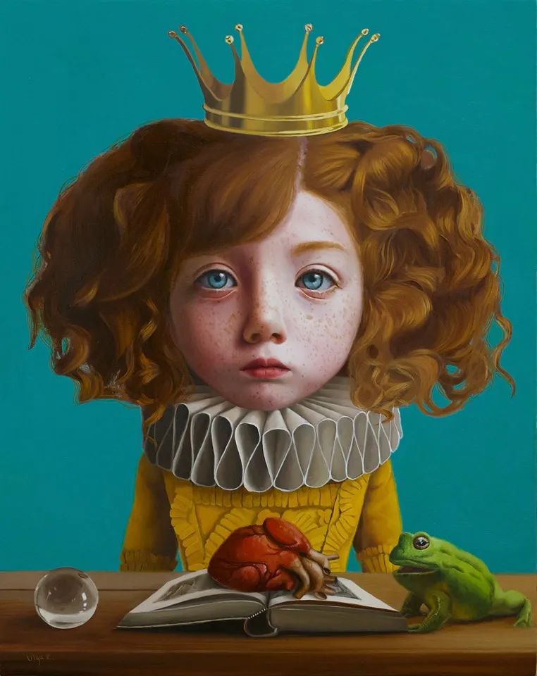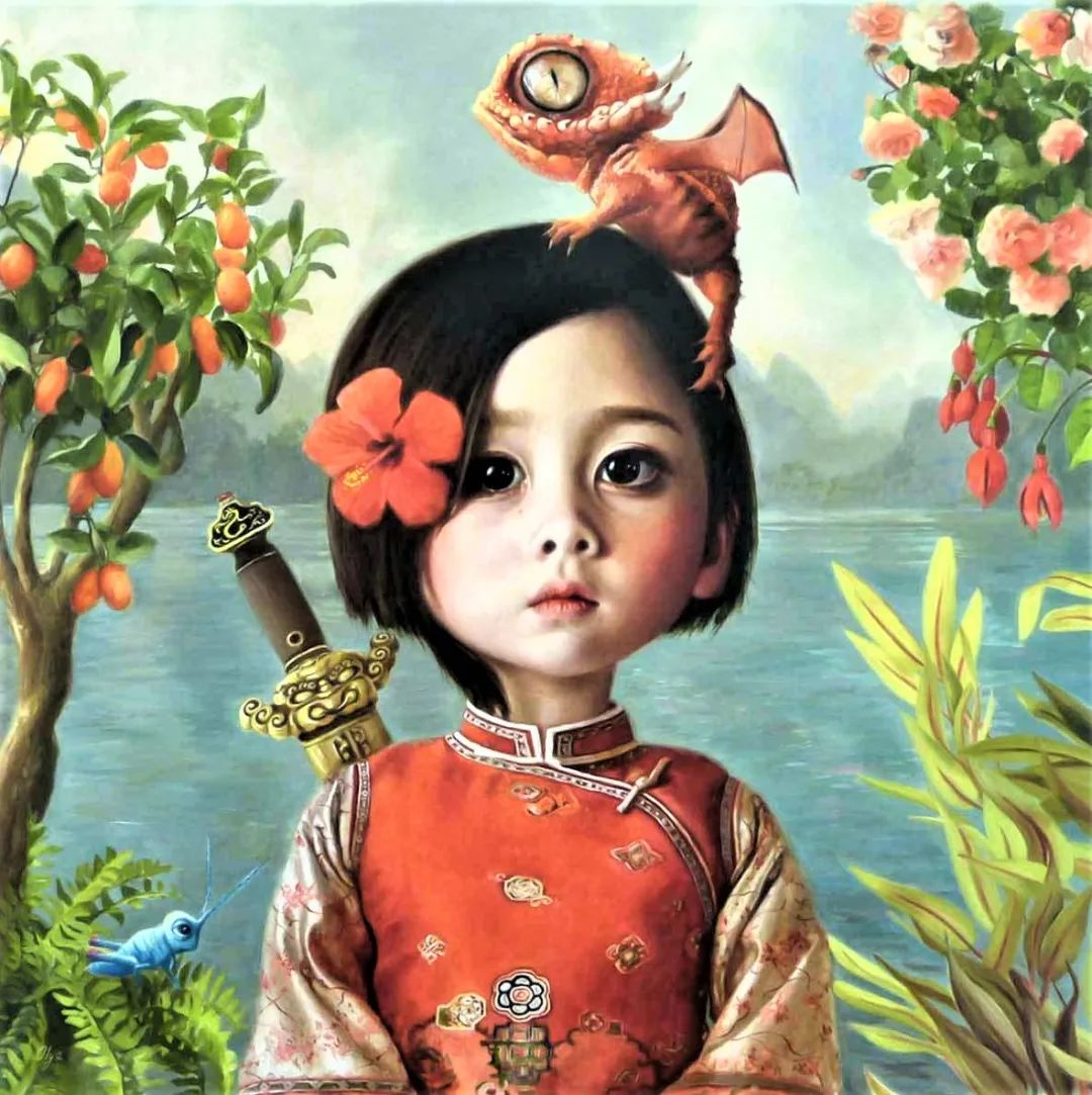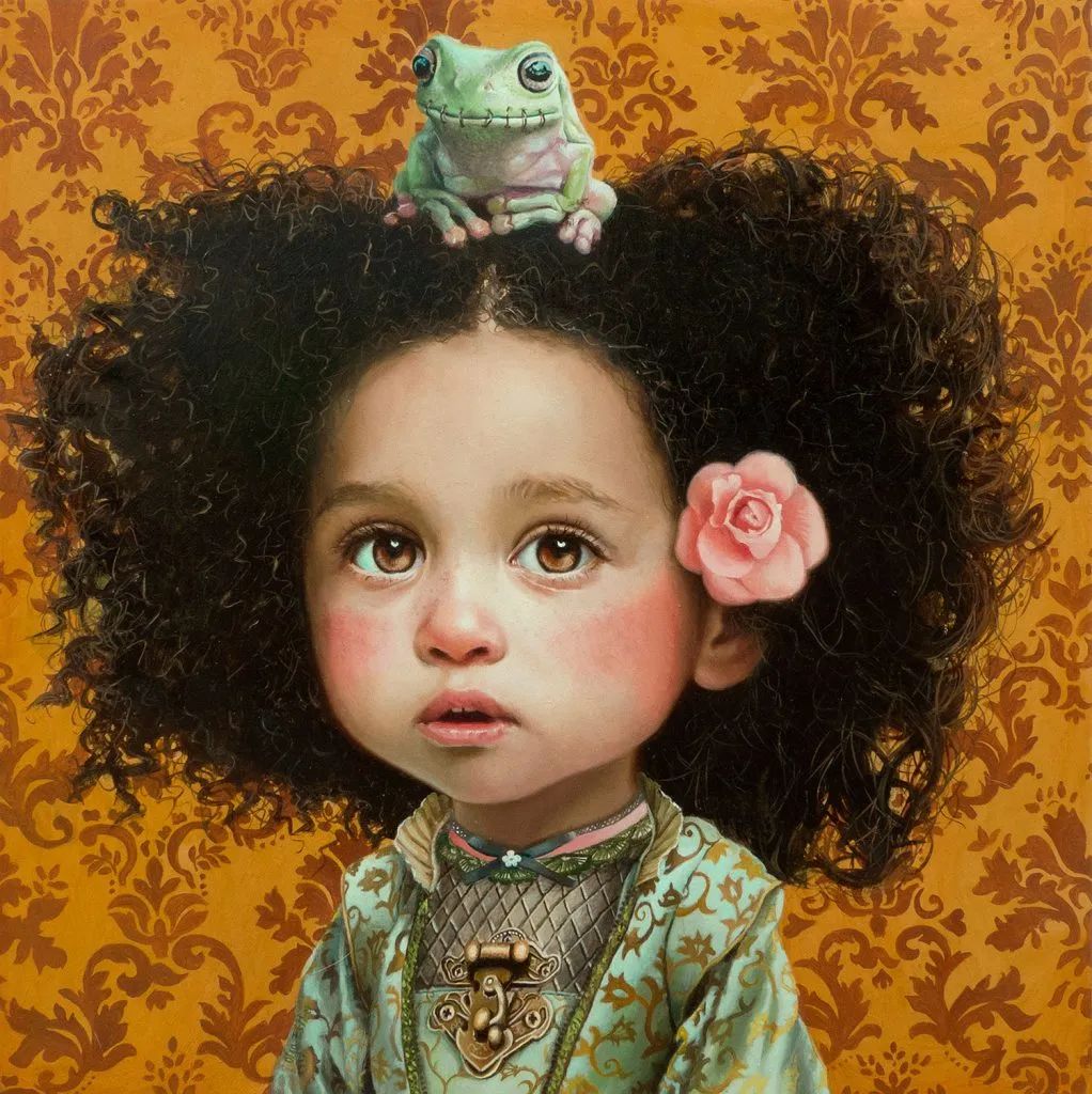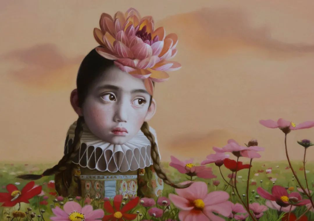儘管畫中時常花團錦簇、夢幻十足、小姑娘常常以公主的裝束和姿態出現,但背井離鄉、童年孤獨的畫家生活從小女孩孤獨、茫然的眼神中流露出來。