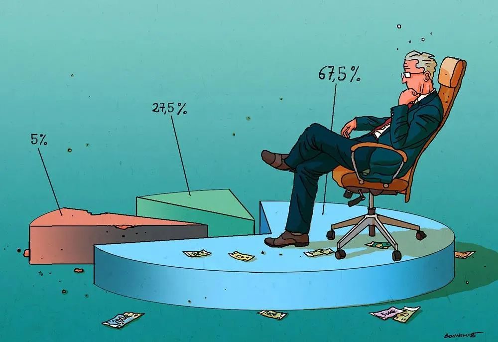 這幅《百分比》和下面一幅《貧困地區人口》可以對照着看。前者富人坐擁絕大多數的資產,紙幣扔的到處都是,一副清閒做派。後者貧困人飢腸轆轆,他可以坐在地球上,但地球上哪些資產屬於他呢?