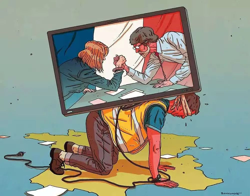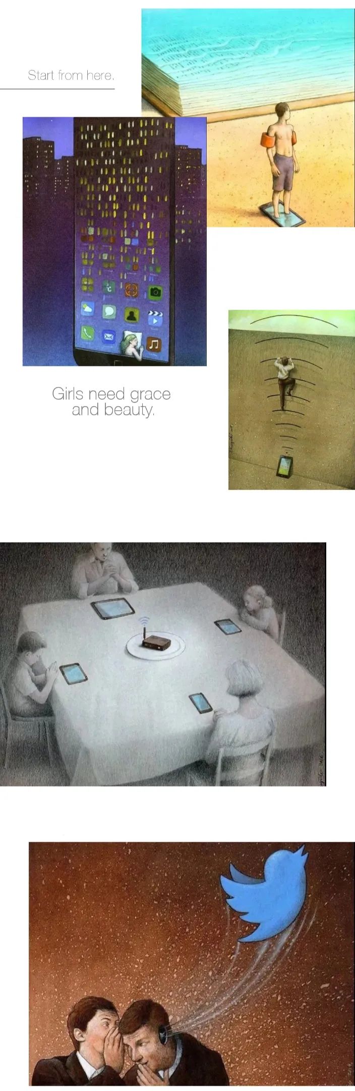 Pawel常常以諷刺的畫法表現網絡世界、新聞媒體對人們的囚禁狀態。比如以下幾幅圖對當代社交媒體、網絡技術、熬夜玩手機、網上衝浪等問題都以滑稽諷刺的手法表達出來。
