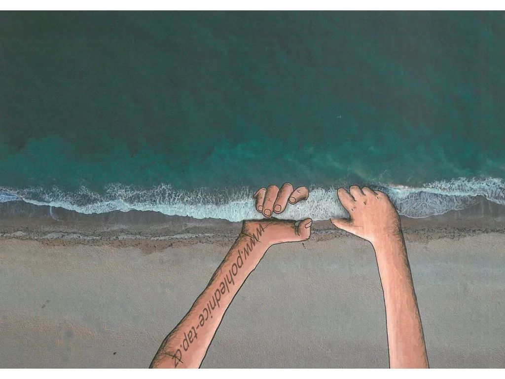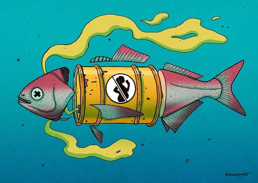 《海洋污染》:最近關于海洋污染的插畫有點多……這幅圖將工業廢物與魚身結合,同時又附上孕婦喝水的圖案,讓人脊背發涼。