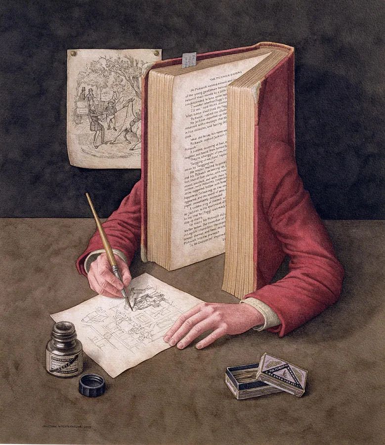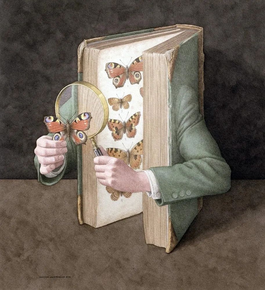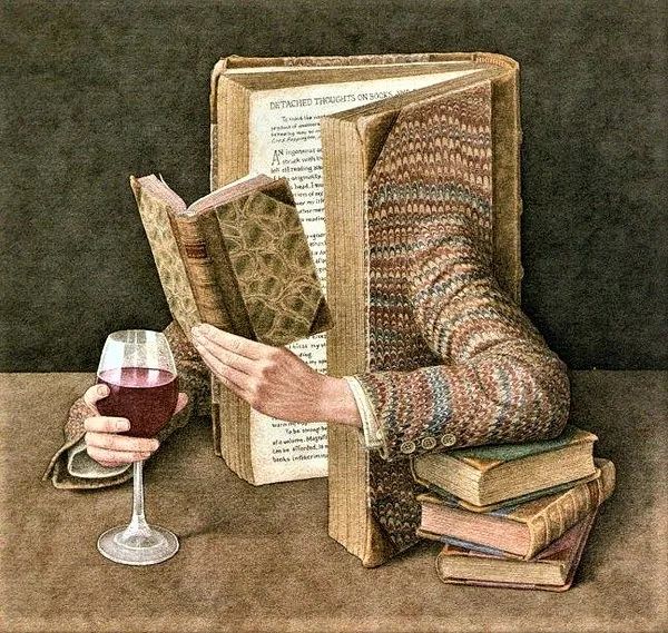 Jonathan是英國一位畫家和插畫師,出於對舊書的熱愛,他在插畫中常常將舊書賦予了人的臂膀以及靈魂。長出了胳膊和雙手的書籍,悠閒地喝酒、寫作。這才是真正的“自娛自樂。”