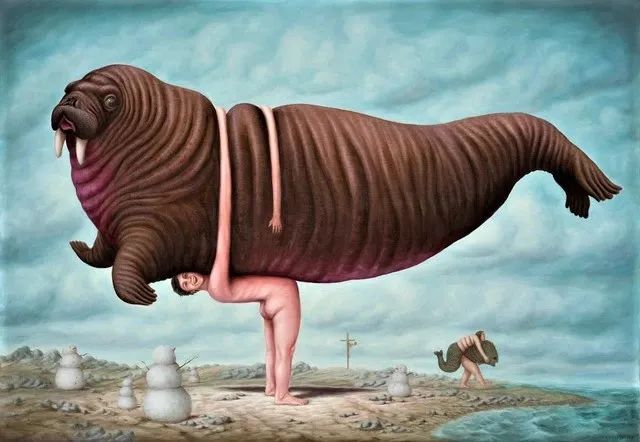 《揹負》:勞動人民汗流浹背,揹負的是上層資本家的手腕較量,形象且具有諷刺意味地告訴你什麼叫“勞心者治人,勞力者治於人”。