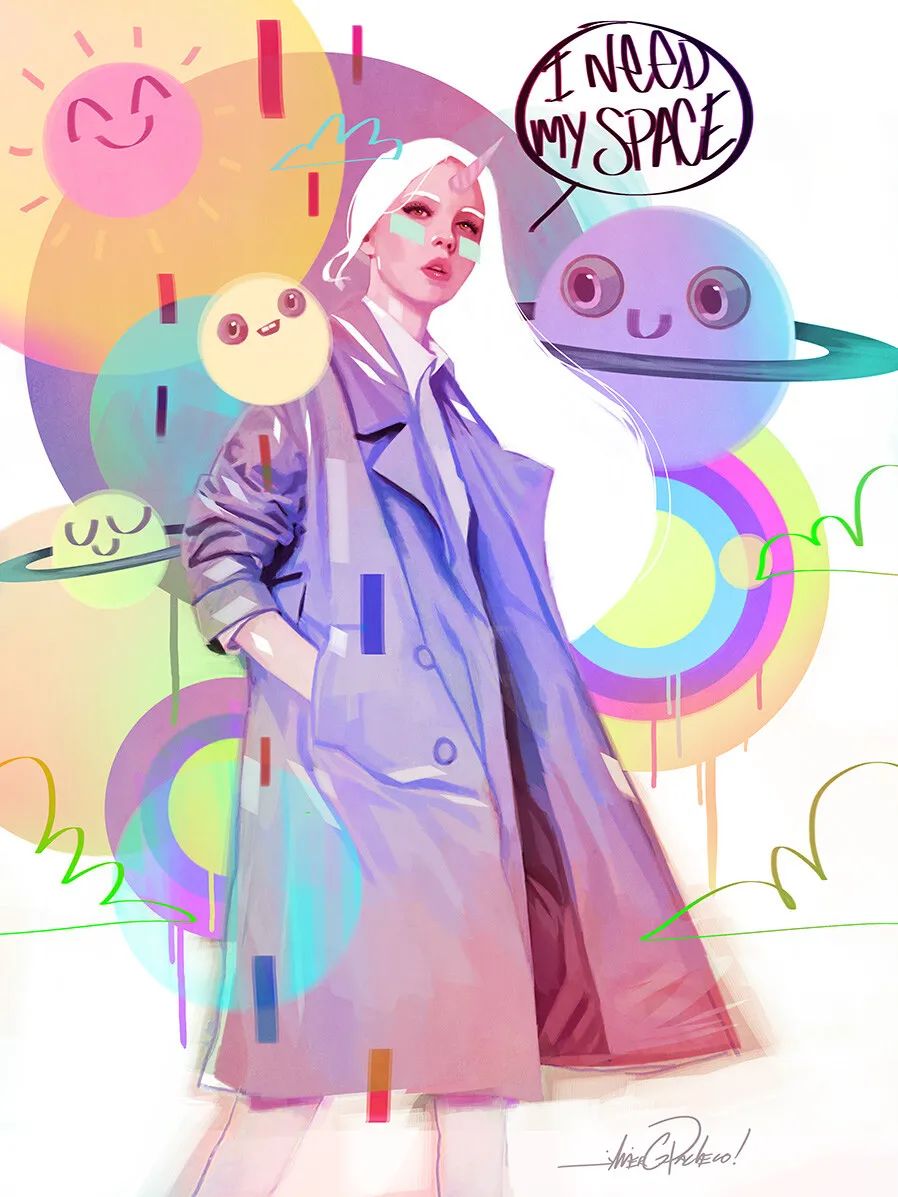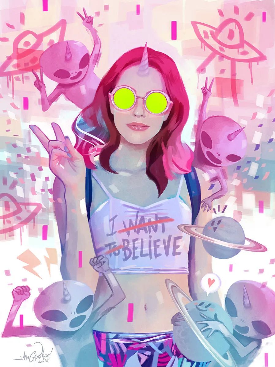 神秘高貴的紅色、“獨角”女性、人體骷髏、外太空,構成了她獨具一格的插畫特色。