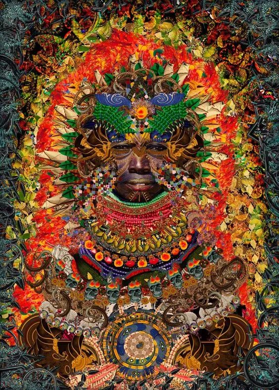 比如以下這幅圖,闡釋了科特迪瓦諺語:“一個老人的死就像一間燃燒的圖書館”。紅黃的火焰圍繞着歷經滄桑的老人臉龐。