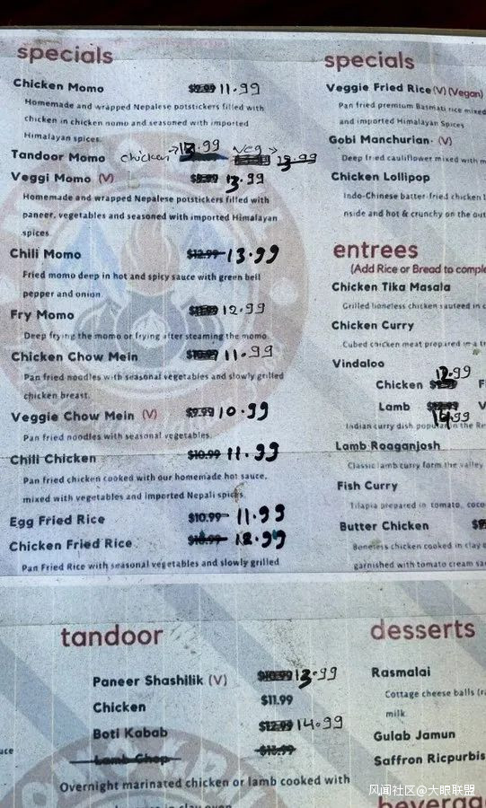 食品原材料的上漲,也迫使一些餐廳開始漲價,甚至連菜單都不換,直接在舊菜單上原地漲價。