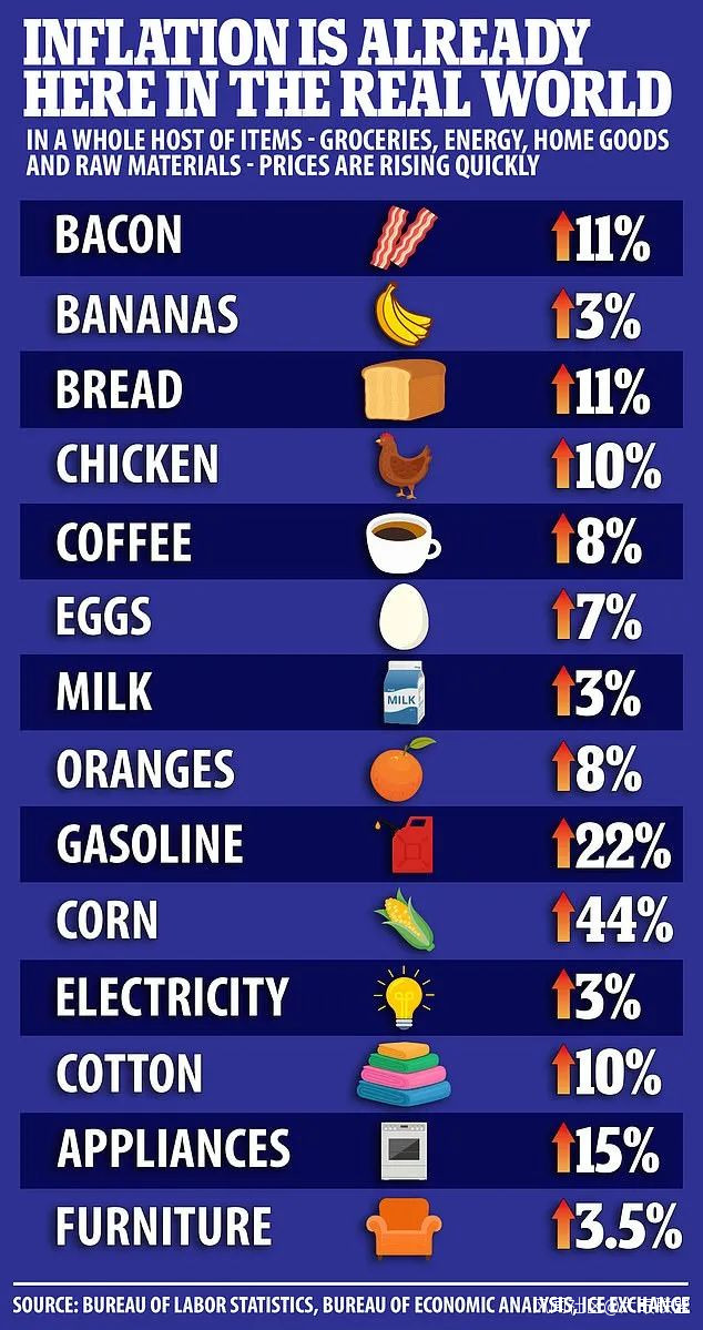 民生用品飆漲 聯邦勞工統計局(Bureau of Labor Statistics)的數據顯示,舉凡民生用品、天然氣、電力等價格,過去一年都在上漲,漲幅是三年來之最;其中,咖啡平均價格上漲8%、麪包上漲11%、汽油上漲22%。數據顯示,總的來説,食品價格過去一年上漲3.5%,能源價格上漲13%;與此同時,各種商品原物料(例如,鋼鐵,木材和棉花)價格也一直飆升;不少企業表示,這些原物料的較高成本將轉嫁給消費者。