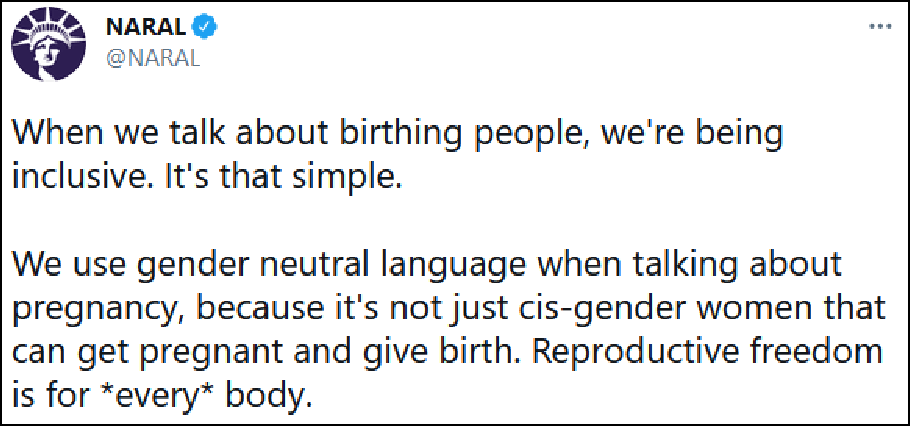 支持女性墮胎權的美國非營利組織NARAL表示,這種措辭可以很好地照顧到“跨性別生育者”的利益。