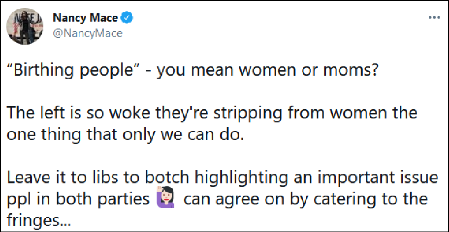 “生育者?你到底在形容女性還是母親?”南卡羅來納州共和黨眾議員南希·梅斯(Nancy Mace)表示,美國左派正在剝奪女性“唯一能做的事”,“如果説有什麼是兩黨在‘迎合邊緣人士’問題上能達成一致的,那就是讓‘自由派’去搞砸一切吧……”