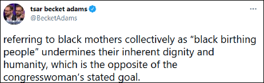 該報另一位作家貝克特·亞當斯(Becket Adams)認為,將黑人母親稱為“黑人生育者”有損她們的尊嚴,這與這位黑人女議員試圖達成的目標“背道而馳”。