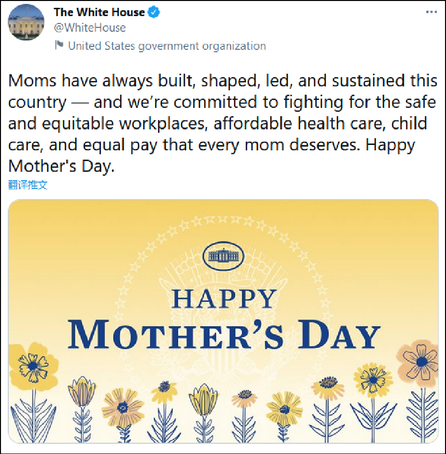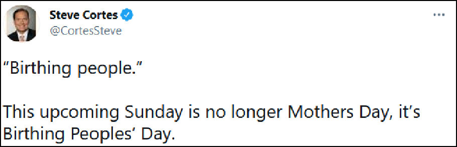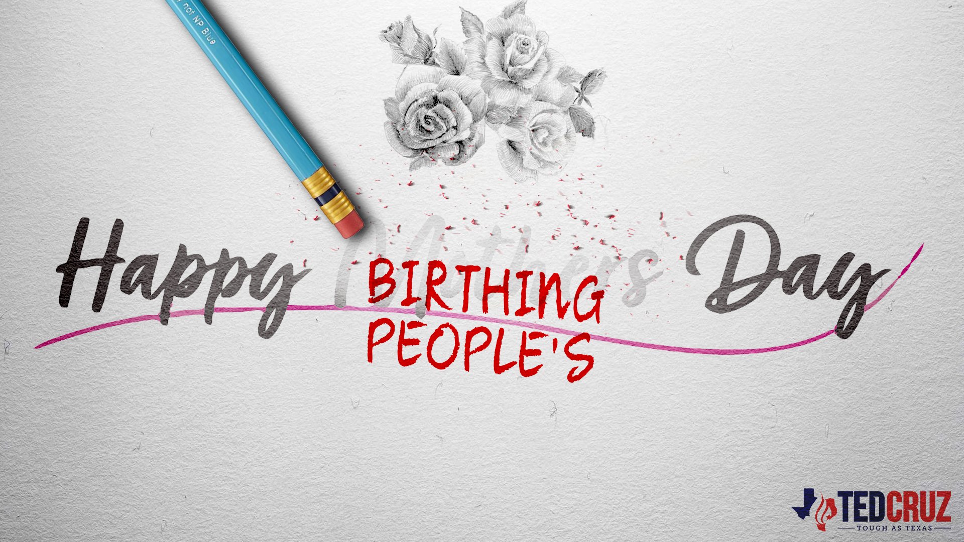 5月9日,白宮官方推特號與眾議院議長南希·佩洛西均使用了“母親”一詞慶祝當天的“母親節”。但共和黨參議員特德·克魯茲則發文配圖嘲諷此事稱:“母親節”快樂?不,要説“生育者節日快樂”!
