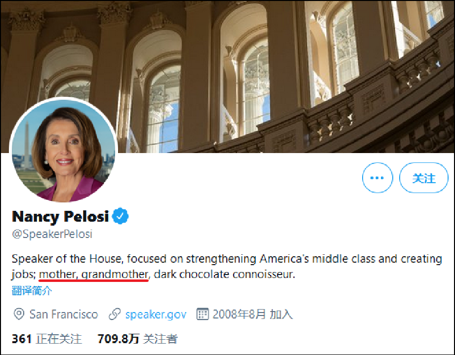 值得注意的是,佩洛西在推特賬號個人介紹中依然使用了“mother”和“grandmother”描述自己。