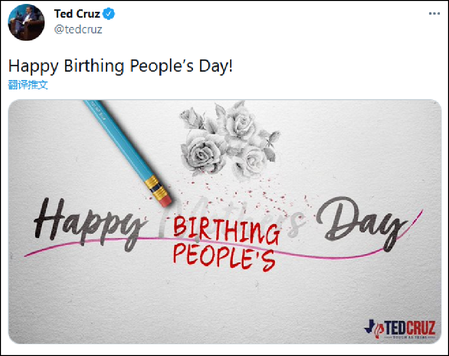 同日,共和黨得克薩斯州參議員特德·克魯茲(Ted Cruz)發文稱“生育者節日快樂”,並配上了一張嘲諷性質的配圖——“母親節”快樂?不,要説“生育者節日快樂”!