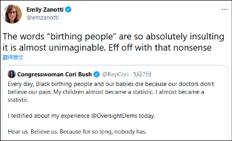 不過,她在聽證會全程一直避免使用“女性”(women)一詞,在社交媒體轉發相關內容時還特意使用了“黑人生育者”(black birthing people)一詞替代“黑人母親”(black mother)的描述。