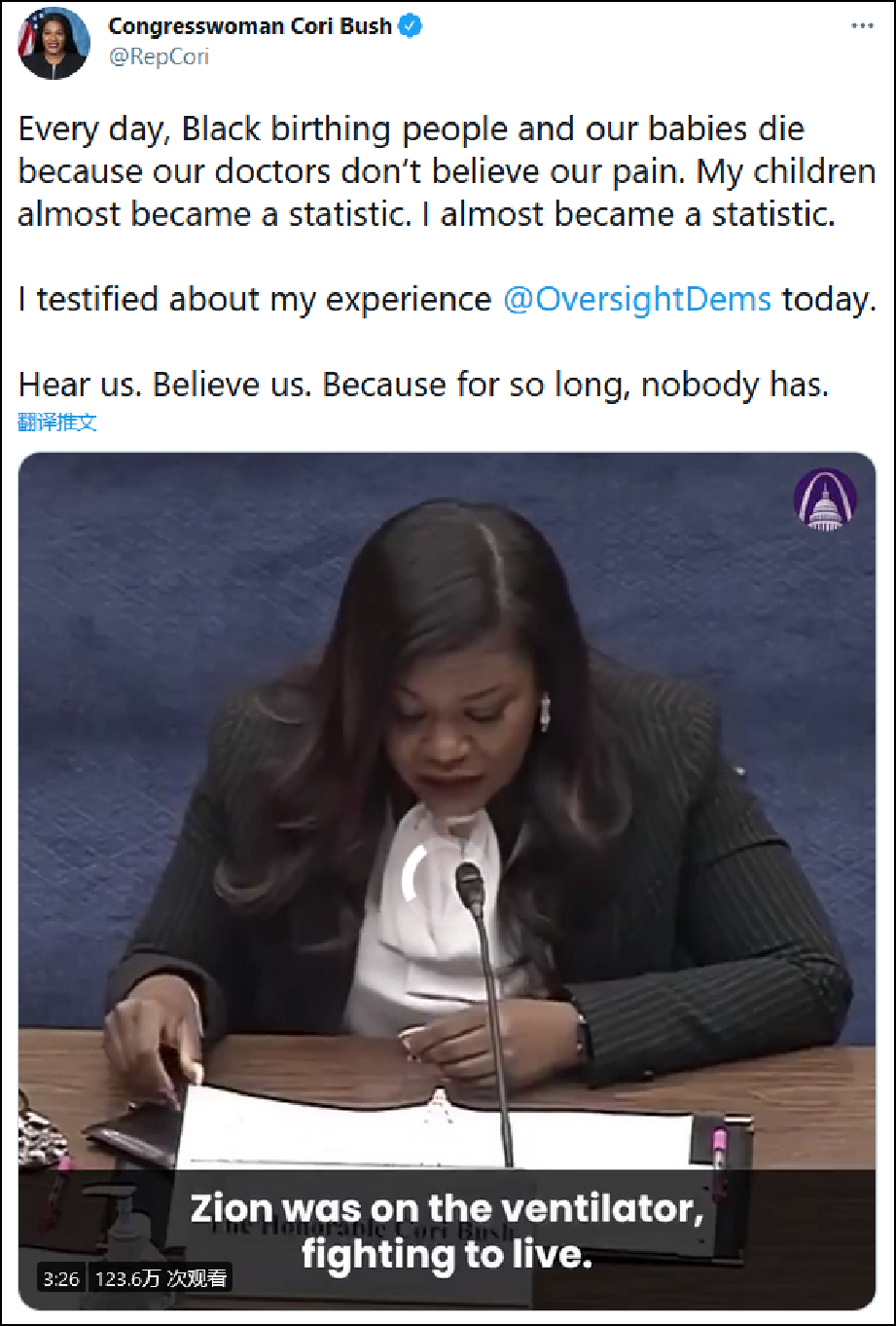 據美國福克斯新聞網當地時間5月7日消息,6日,美國密蘇里州民主黨眾議員科妮·布什(Cori Bush)在民主黨監督委員會的聽證會上,試圖通過講述自己懷孕時曾經遭受過的困難經歷,以提高人們對“黑人孕婦死亡率不斷上升”的認識。