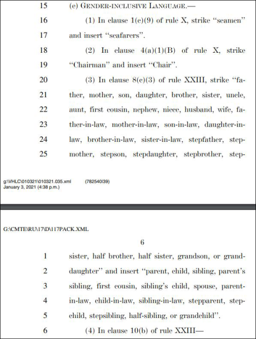 事實上,早在今年1月,佩洛西牽頭髮布的“第117屆美國國會規則”草案中就曾提到要替換掉現有公文中“具有性別取向性”的詞彙,具體規定在了草案的“特定性別詞彙使用”一節。