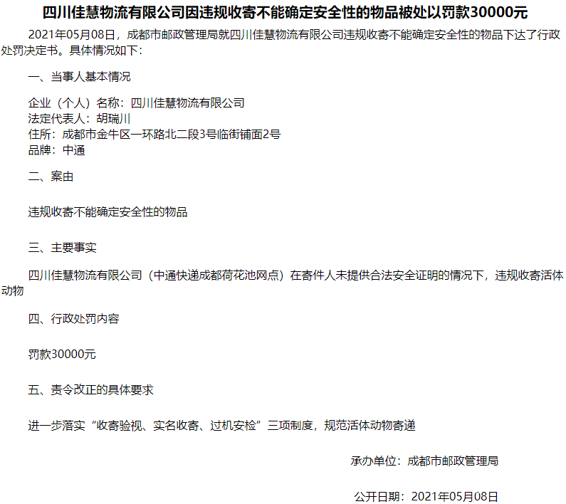 中通快遞“寵物盲盒”處理結果公佈,根據《快遞市場管理辦法》等相關規定,成都市郵政管理局依法對快遞網點、快遞區域管理中心分別作出罰款3萬元、5萬元的行政處罰決定。