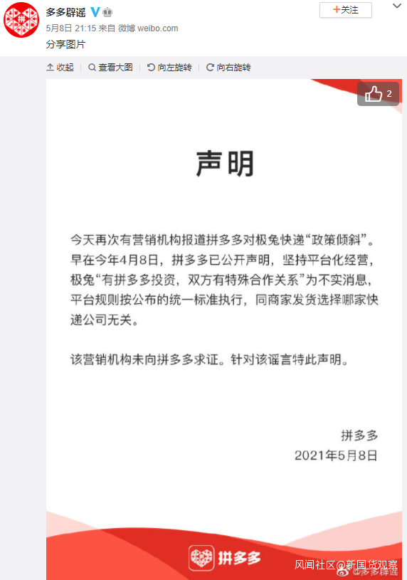 5月8日晚,拼多多發佈聲明稱,今天再次有營銷機構報道拼多多對極兔快遞“政策傾斜”。早在今年4月8日,拼多多已公開聲明,堅持平台化經營,極兔“有拼多多投資,雙方有特殊合作關係”為不實消息,平台規則按公佈的統一標準執行,同商家發貨選擇哪家快遞公司無關。