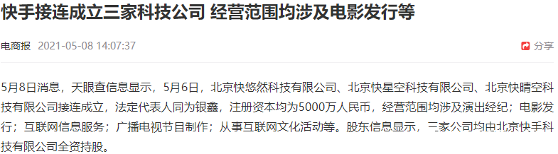 快手接連成立三家科技公司,經營範圍均涉及電影發行等。