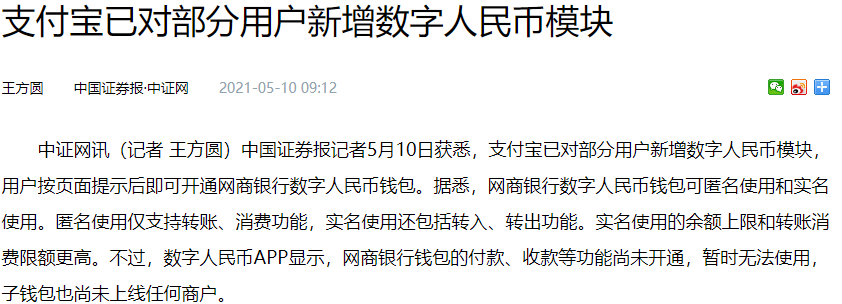 支付寶已對部分用户新增數字人民幣模塊,用户按頁面提示後即可開通網商銀行數字人民幣錢包。