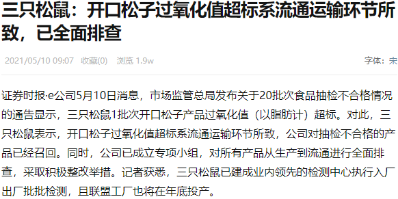 日前,市場監管總局發佈關於20批次食品抽檢不合格情況的通告顯示,三隻松鼠1批次開口松子產品過氧化值(以脂肪計)超標。對此,三隻松鼠回應稱,開口松子過氧化值超標系流通運輸環節所致,在獲悉抽檢結果異常的情況後,公司第一時間召回該批次產品,並開通售後專線全天候為消費者辦理相關售後事宜。