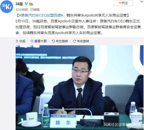 原首汽約車CEO魏東正式加盟百度,擔任百度智能駕駛事業羣副總裁、百度智能駕駛事業羣首席安全運營官,後續魏東將牽頭百度Apollo共享無人車的商業運營。