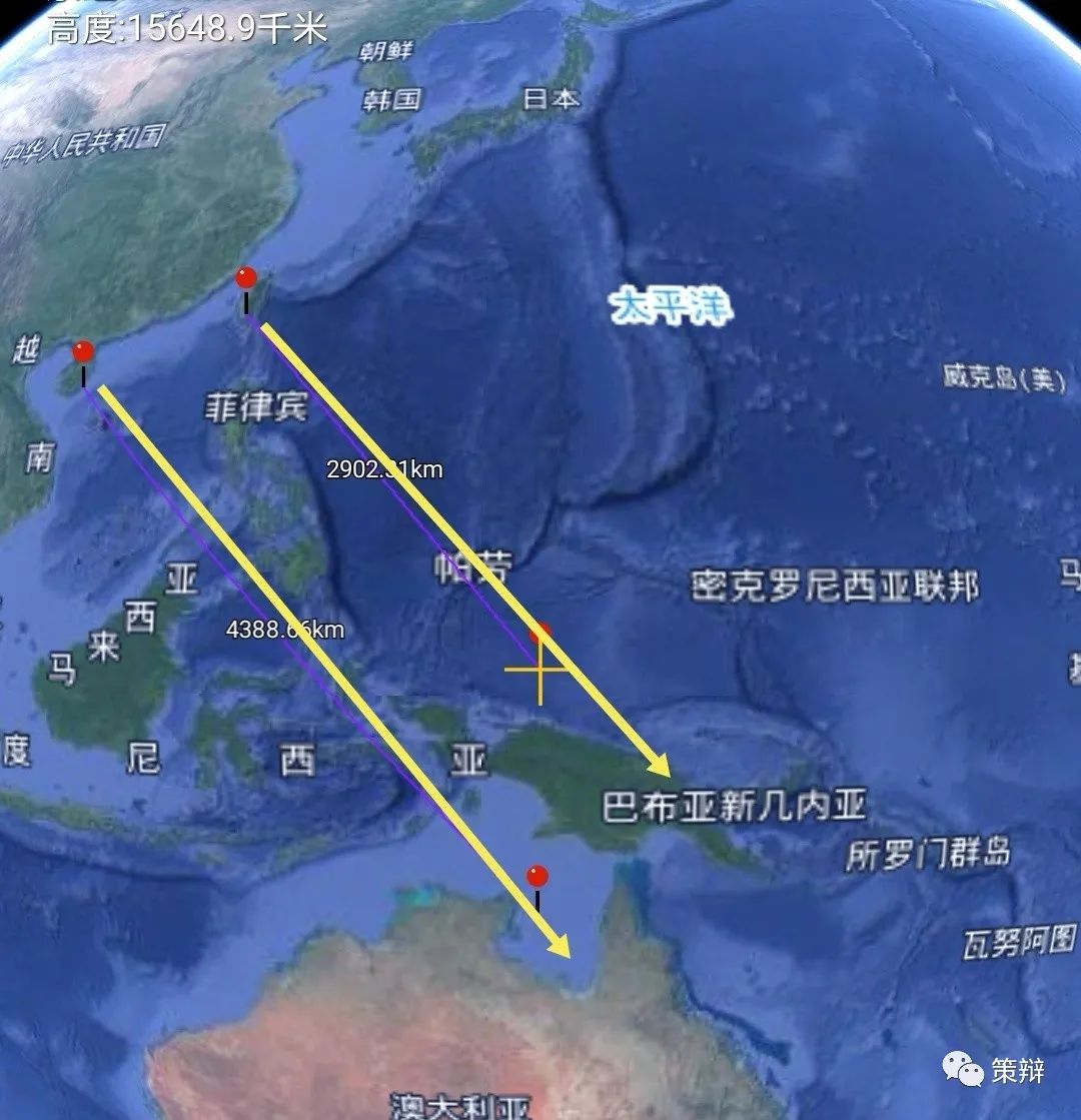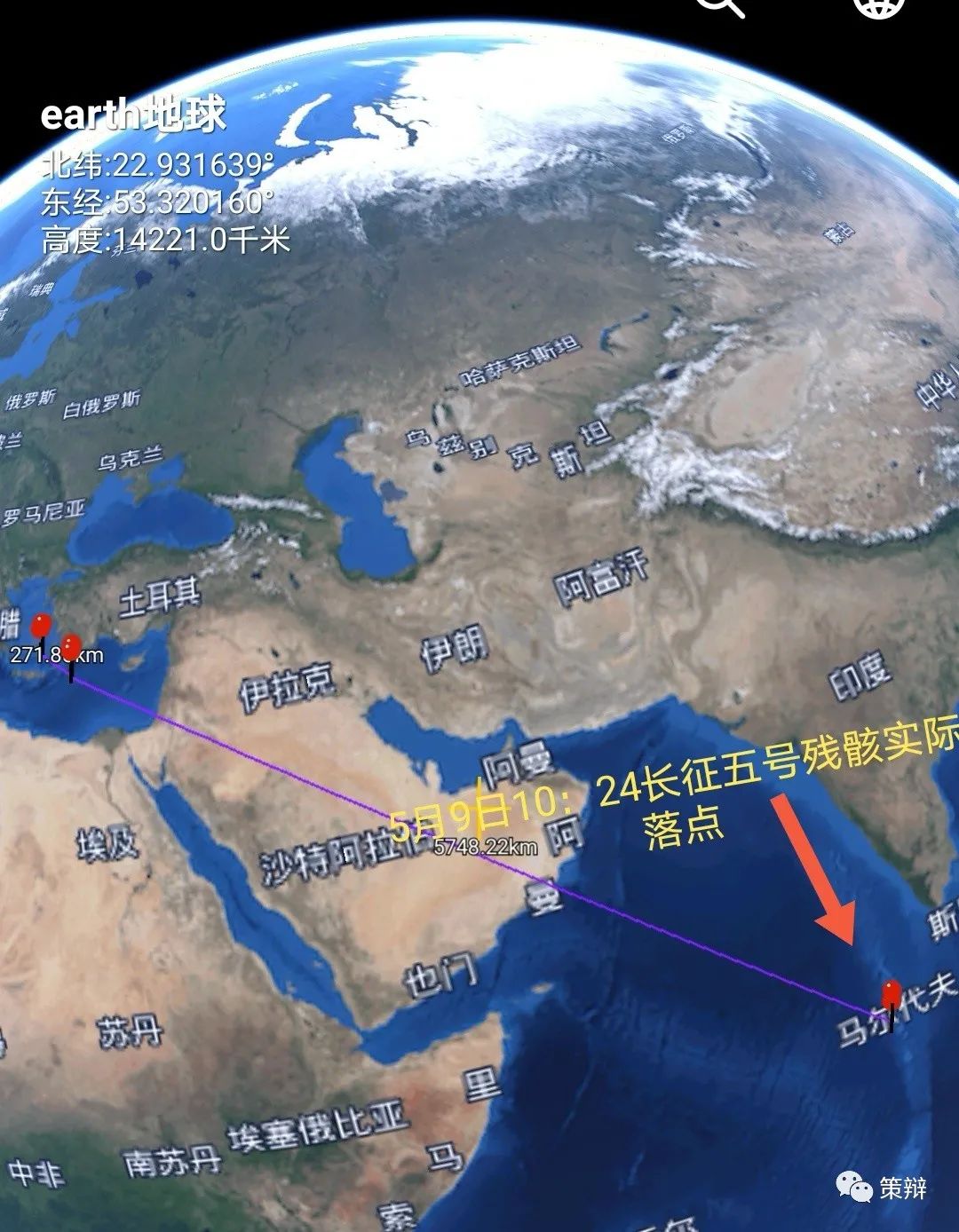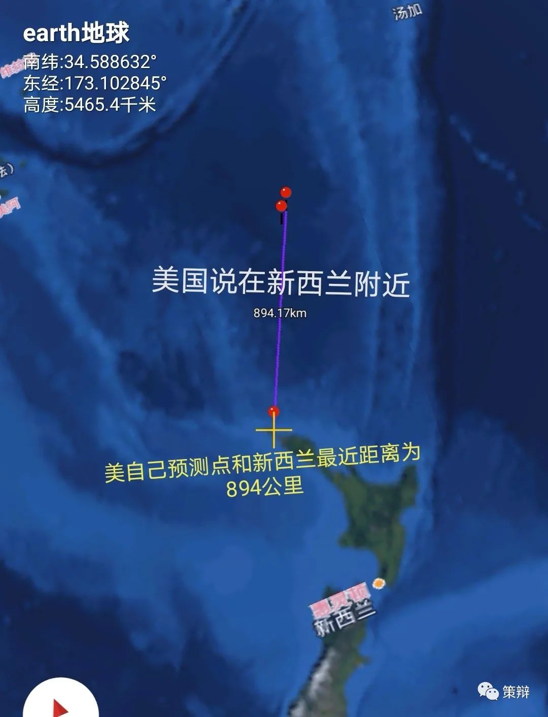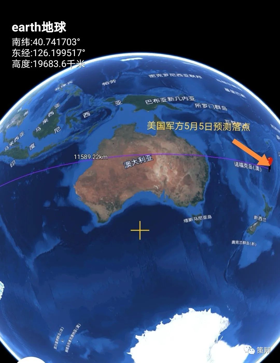 與它藍星第一太空軍5月5日炒作預測的落點,差了11589公里!四分之一個地球還多,反正兩點連線測距的時候,硬是沒有能把它們放在一個手機屏幕框裏。