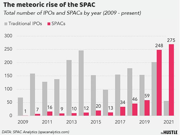 2021年勢頭更加兇猛,僅僅第一季度,SPAC數量就直接飈到了275個,比去年一整年都多,募集資金840億美元以上,超過了同期傳統IPO數量的500%。