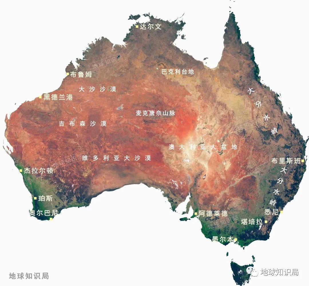 澳大利亞領土面積高達769萬平方千米,其主體部分是一整塊大陸。該大陸地勢相對平坦,整體上海拔不高,既缺乏高山,也缺少大河。但是有限的山脈、高原和時令河沉積出的河灘上卻遍佈着各類礦產資源。