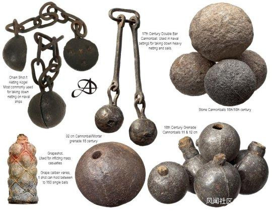 以英國海軍為例,其加農炮一般會使用重量為19公斤的炮彈,到了17世紀後半葉,一種形狀長而窄的8公斤重炮彈開始被普遍列裝,它們構成了炮手們在海戰時的無限開火權。而薩克爾火炮、銃槍和蛇炮等小型單兵操作的火炮,則專門用來對付船上的人員。