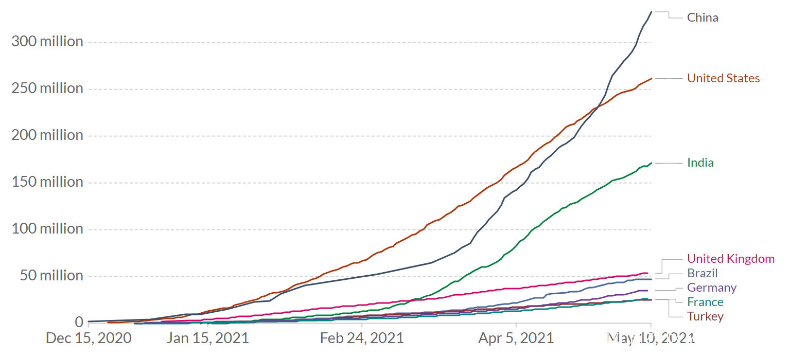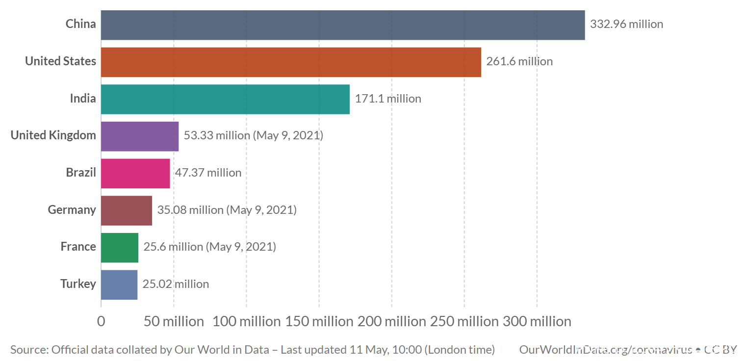 截止2021年5月10日,美國累計接種2.62億劑,居第二位,其中單日新增接種188萬劑。美國至少接種一劑的人羣佔比為45.7%,完成兩劑次的人羣佔比為34.5%。美國每百人累計接種78.22劑,是中國的3.38倍。自3月23日以來,美國日均接種276萬劑,為中國同期日均接種數的54%。