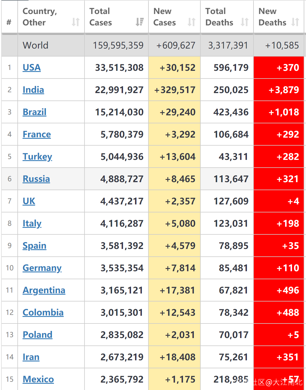 5月10日,全球新增新冠確診61.3萬例;累計確診1.596億例;新增病亡1.06萬例;累計病亡331.7萬例。