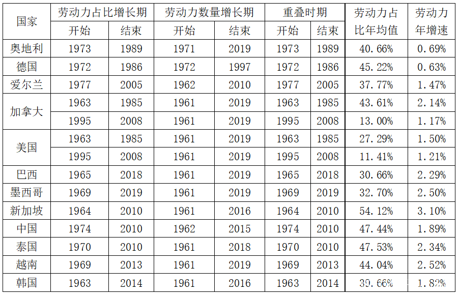 選取歐洲的奧地利、德國、愛爾蘭三個國家分析潛在的“人口紅利機會窗口”,可以看到三者的重疊時期分別為1973-1989、1972-1986、1977-2005年,期間的勞動力佔比年均值都比較高,都在35%以上,但是從勞動力數量增速來看,除了愛爾蘭比較高,1.47%左右外,其餘兩個國家的年增速都在1%以下,總體“人口紅利機會窗口”不明顯。
