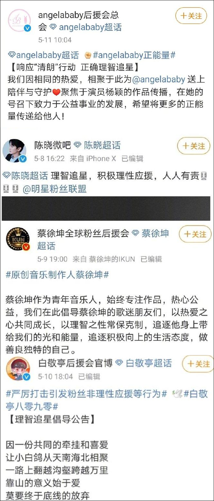 近日,國家網信辦部署開展 2021 年 " 清朗 " 系列專項行動,嚴厲打擊引發網絡粉絲羣體非理性發聲、應援等的行為。隨後,超200家粉絲後援會響應網信辦號召,呼籲理智追星。