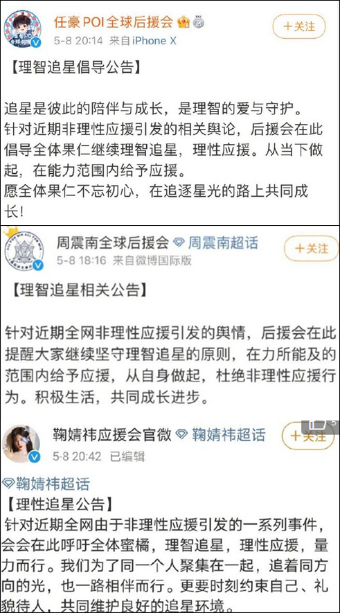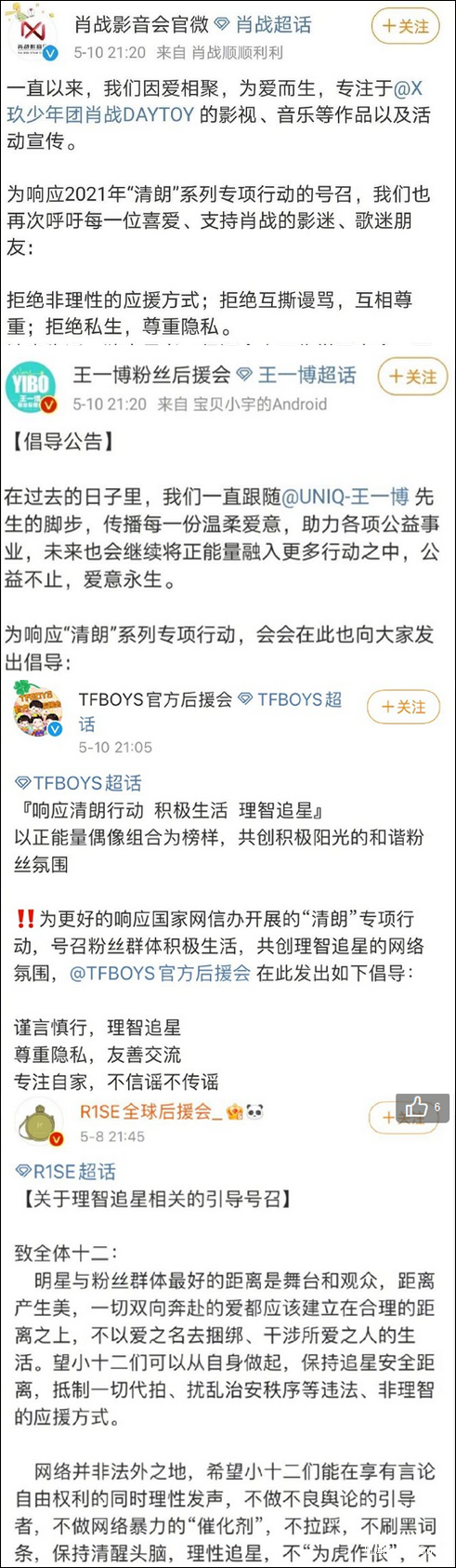 5月8日,國家網信辦部署開展2021年“清朗”系列專項行動,重拳整治網絡違法違規問題。其中提到,要規範明星及其背後機構、官方粉絲團的網上行為,嚴厲打擊網絡暴力,引發網絡粉絲羣體非理性發聲、應援等的行為。
